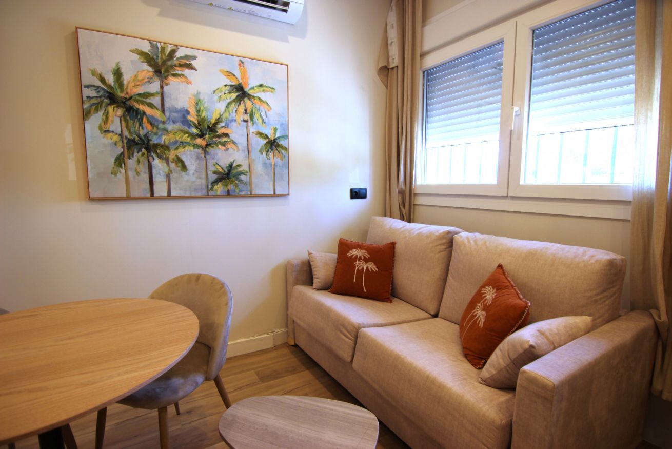 Estudio elegante y recién reformado, con una cama doble y sofá cama. Se encuentra en la calle Juan Ramón Jiménez, frente a la Portada de la Feria. Su diseño y ubicación lo convierten en una opción ideal para disfrutar de Sevilla con confort y estilo.